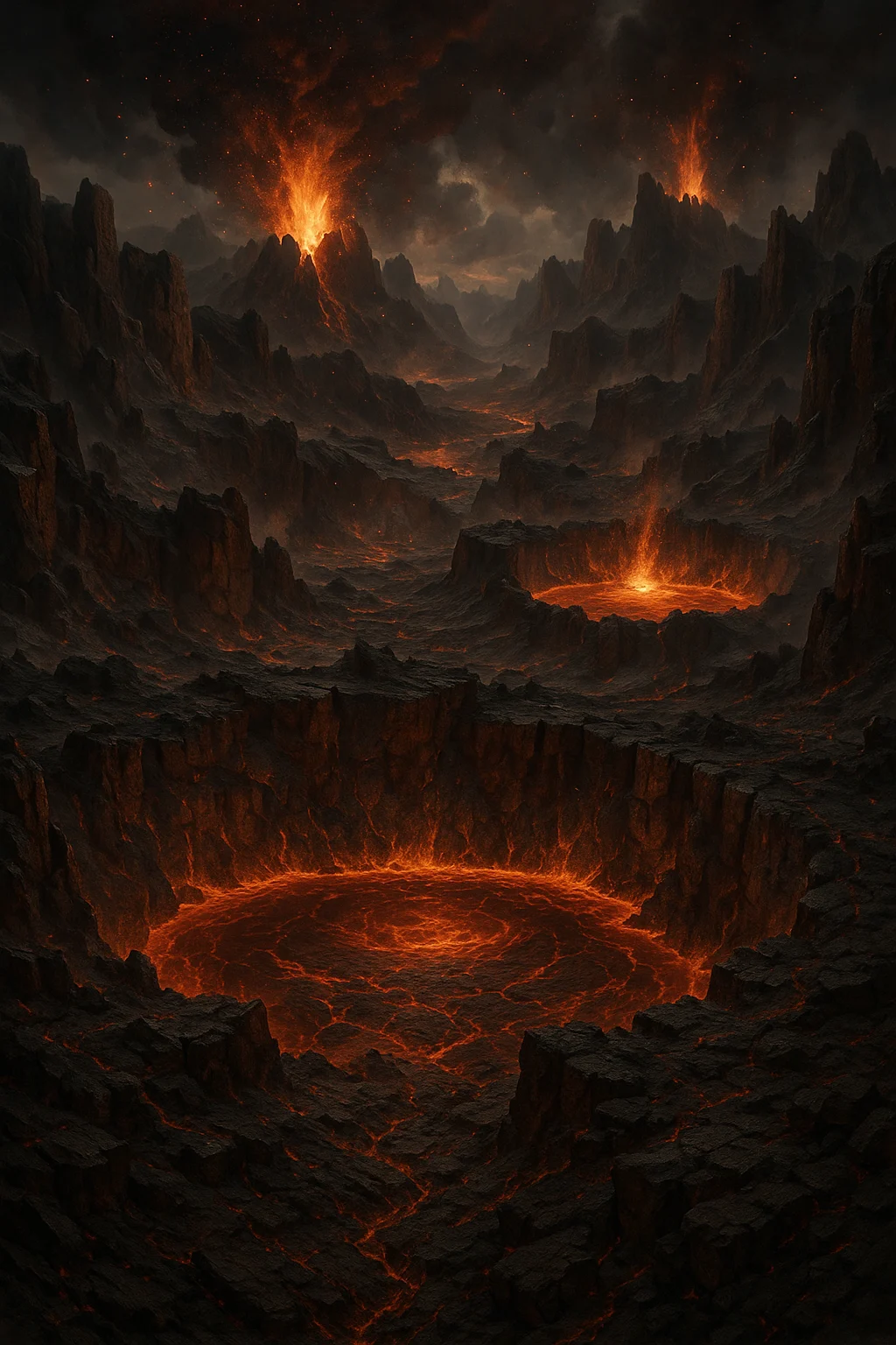 Colossal craters filled with molten lava, smoke and ash choking the skies.