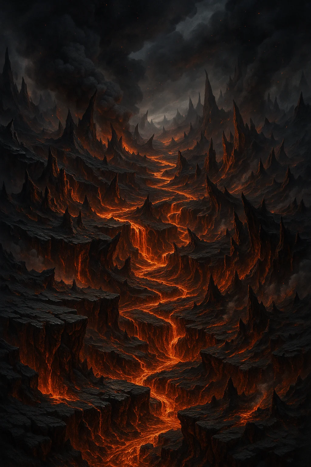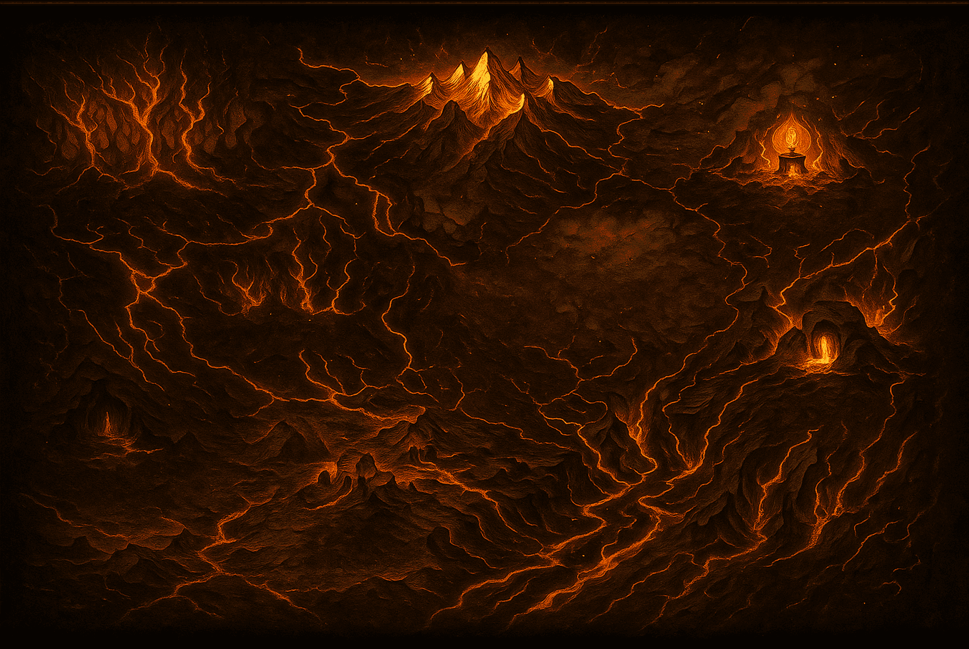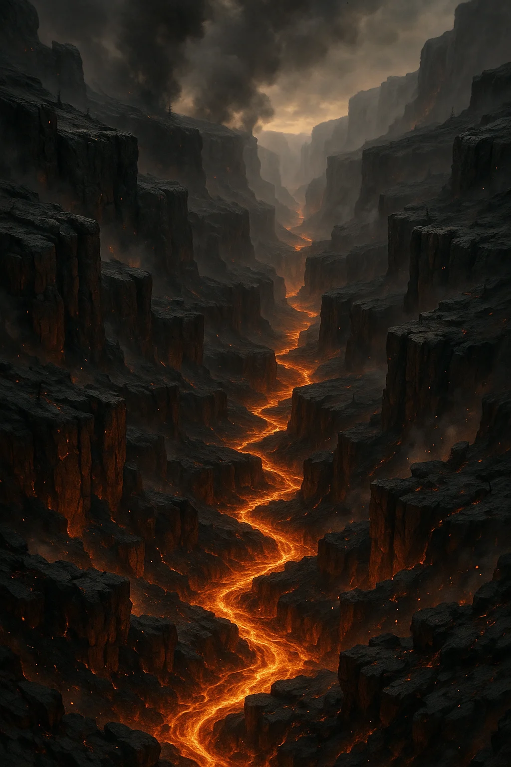 Deep, jagged canyons carved by fire and fury, glowing with ember-lit cracks.
