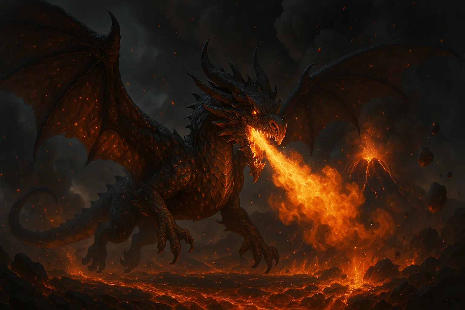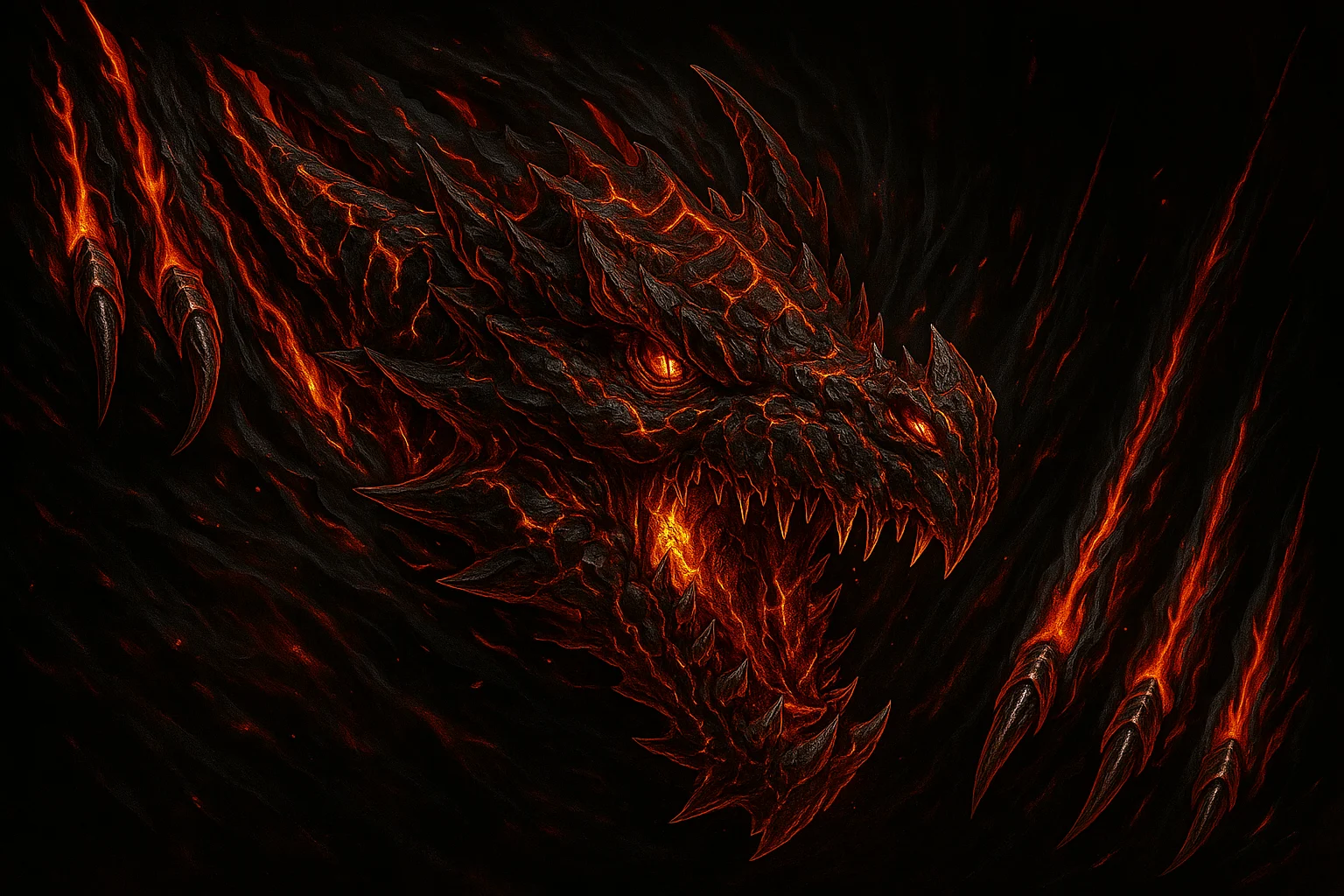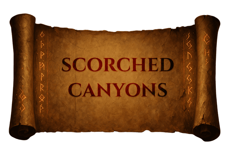 Deep, jagged canyons carved by fire and fury, glowing with ember-lit cracks.