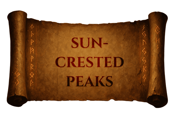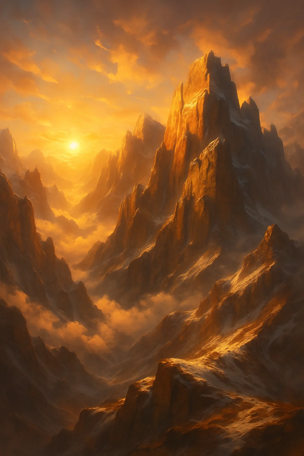 Towering golden-lit mountains kissed by the eternal sun, clouds circling below radiant summits.
