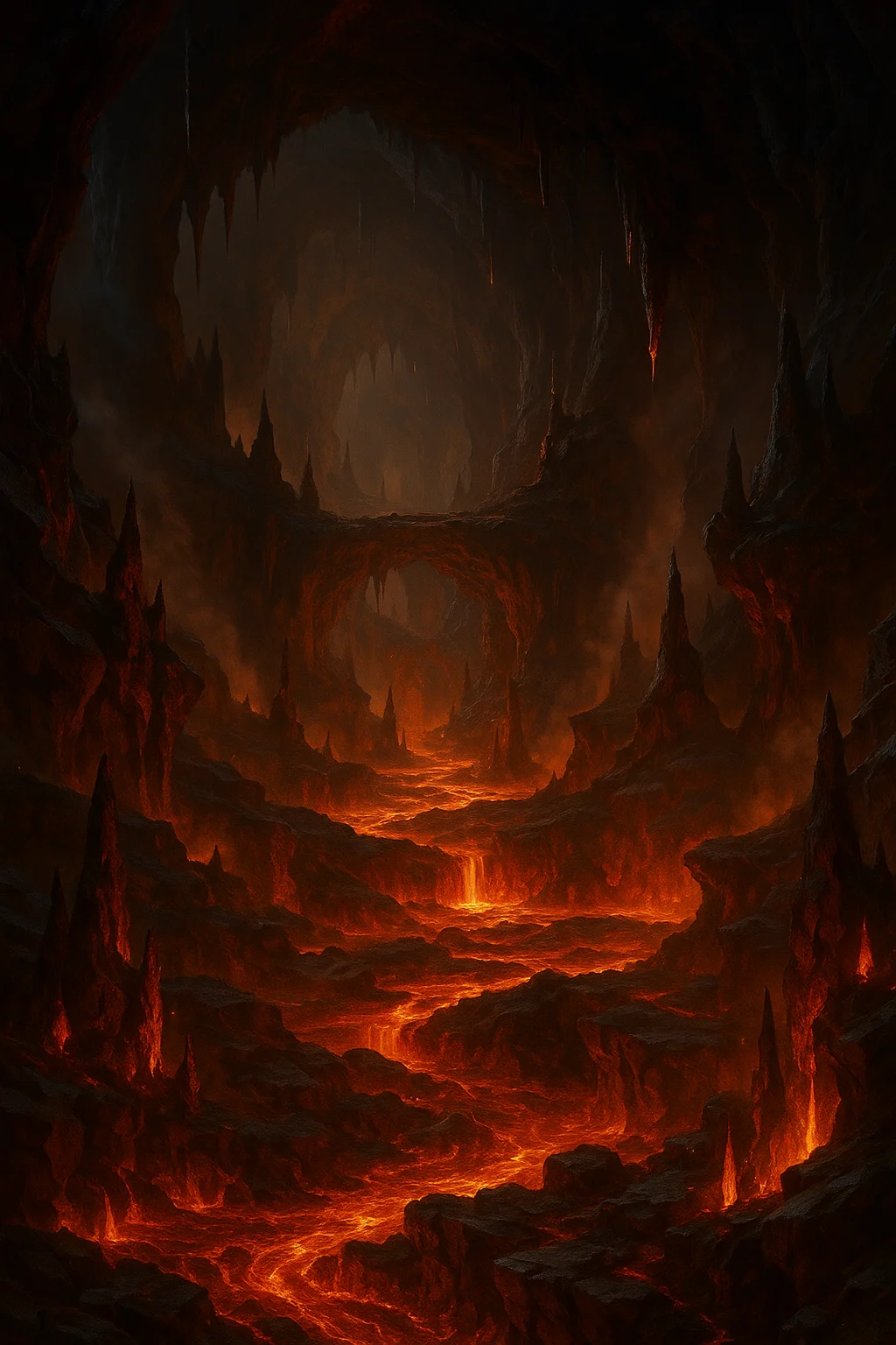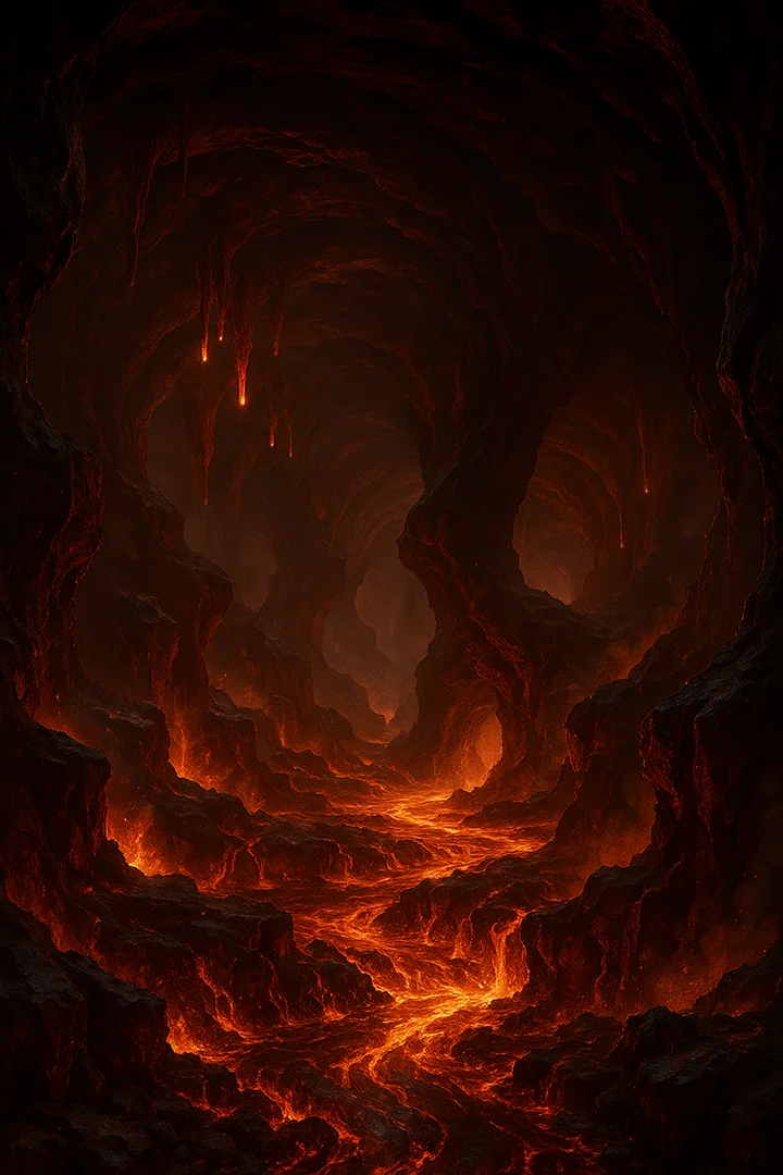 Vast underground caverns lit by molten rivers, jagged walls glowing with searing heat