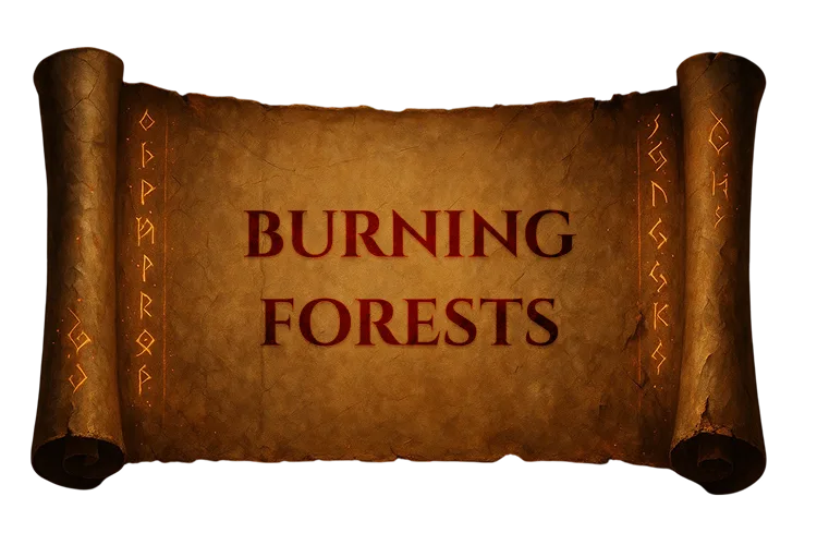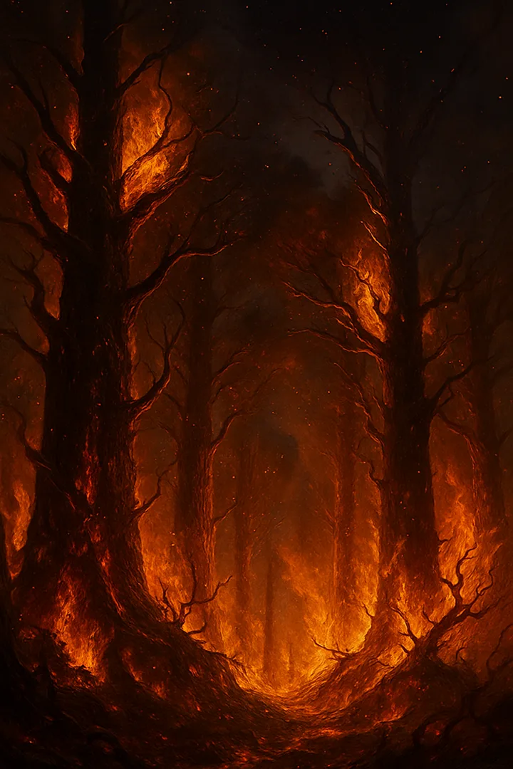 Vast woodlands locked in eternal blaze. Trees burn but never fall, their ashes feeding new flames.