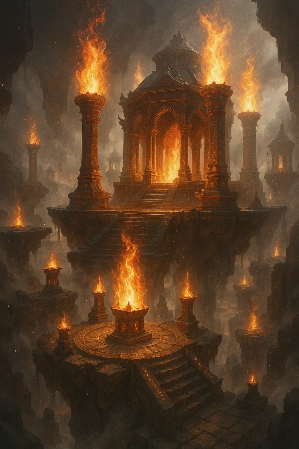 Floating sanctuaries and temples wreathed in divine fire, glowing altars suspended in the sky.