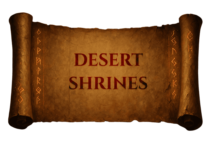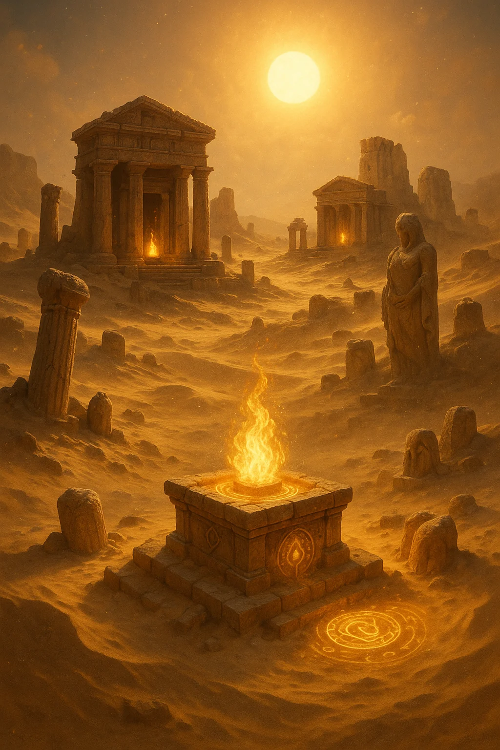Endless golden sands hide ancient stone temples, each lit by eternal flames.